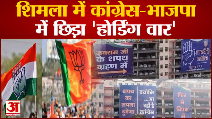 Himachal Pradesh Election 2022: हिमाचल प्रदेश विधानसभा चुनाव से पहले राजधानी शिमला में भाजपा और कांग्रेस में होर्डिंग वार छिड़ा हुआ है। शिमला की प्राइम लोकेशन लिफ्ट कार पार्किंग पर भाजपा और कांग्रेस ने 45 बाई 50 फीट के विशालकाय होर्डिंग लगाए हैं।