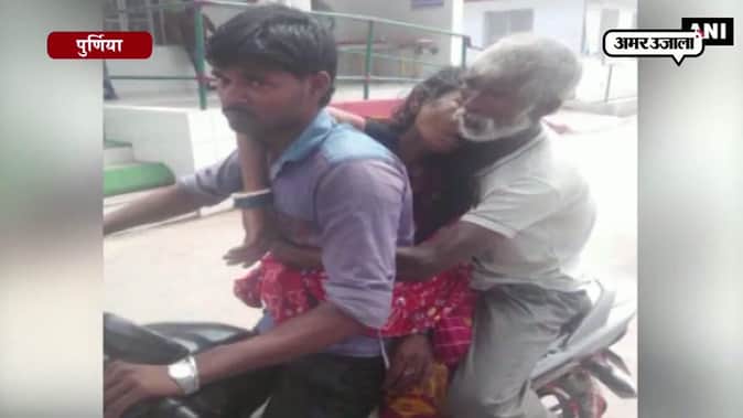 बिहार के पूर्णिया से एक पत्नी की लाश को मोटरसाइकिल पर ढोने की तस्वीरें सामने आई हैं। बताया जा रहा है कि बीते शुक्रवार को सरकारी अस्पताल में महिला की मौत हो गई थी जिसके बाद परिवार ने शव घर ले जाने के लिए अस्पताल से एंबुलेंस की मांग की तो अस्पताल ने किनारा कर लिया। जिसके बाद मजबूरन पत्नी के शव को पति पीठ पर बांधकर लाश मोटरसाइकिल से घर ले आया।