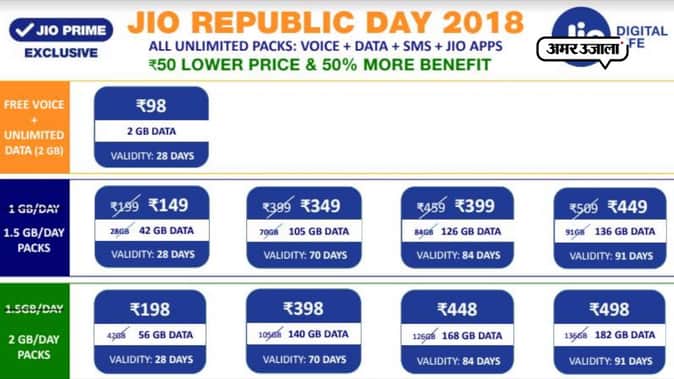 टेलीकॉम सर्विसेज सेक्टर में एंट्री करते ही धमाका मचा देने वाली मुकेश अंबानी की कंपनी Jio रिपब्लिक डे पर नया ऑफर देने वाली है। कंपनी के नए प्लान्स पहले लॉन्च हुए प्लान्स से न सिर्फ 50 रुपये सस्ते होंगे, बल्कि पहले से ज्यादा डेटा इन प्लान्स में कस्टमर्स को मिलेगा।