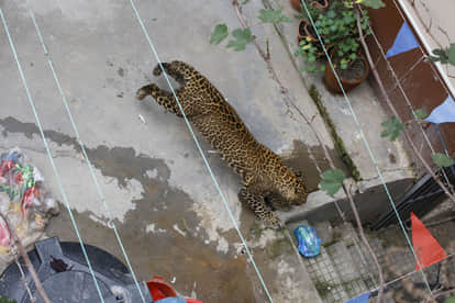 गुरुग्राम के सोहना की दुर्गा कॉलोनी में बुधवार को एक तेंदुआ घुस आया। कॉलोनी के लोगों ने वन विभाग की टीम को इसकी सूचना दी। मौके पर पहुंची वन विभाग की टीम ने ट्रैंक्विलाइजर देकर तेंदुए को काबू किया।