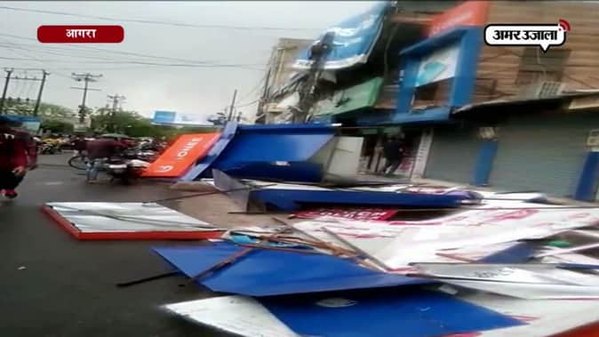 यूपी के आगरा में गुरुवार शाम तेज आंधी आने से कई दुकानें छतिग्रस्त हो गईं। आगरा की प्रमुख शाह मार्केट की कई दुकानों में लगी होर्डिंग और ग्लोसाइन बोर्ड उखड़ गए। आंधी की रफ्तार 92 किलोमीटर प्रति घंटा आंकी गई।