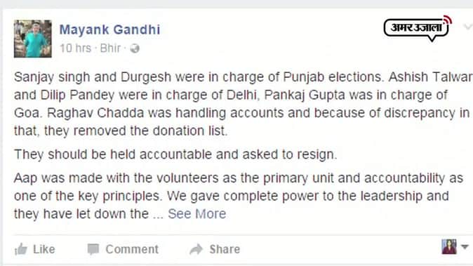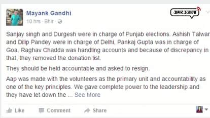 आम आदमी पार्टी की लगातार गिरती साख की वजह पार्टी के पुराने कार्यकर्ता अरविंद केजरीवाल के सलाहकारों को मानते हैं। इसी सिलसिले में योगेंद्र यादव के खत के बाद अब मयंक गांधी ने अपने फेसबुक पेज पर एक पोस्ट किया है, इस पोस्ट में मयंक गांधी ने उन नेताओं के नाम उजागर किए हैं, जिन्हें पार्टी ने पंजाब और गोवा विधानसभा चुनावों की जिम्मेदारी सौंपी थी। इस पोस्ट में दिल्ली एमसीडी चुनाव के लिए जिम्मेदार लोगों को भी निशाना बनाया गया है।