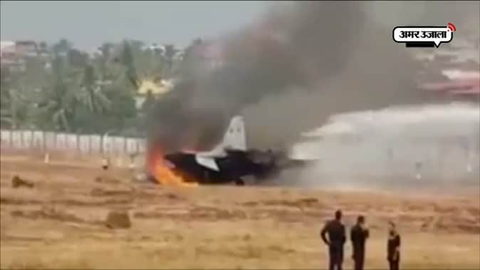 गोवा में वायुसेना का फायटर जेट MIG-29 दुर्घटनाग्रस्त हो गया। ये हादसा तब हुआ जब एक ट्रेनी पायलट विमान से उड़ान भरने वाला था लेकिन रनवे पर ही जेट फिसल गया और विमान में आग लग गई। देखिए तस्वीरें।