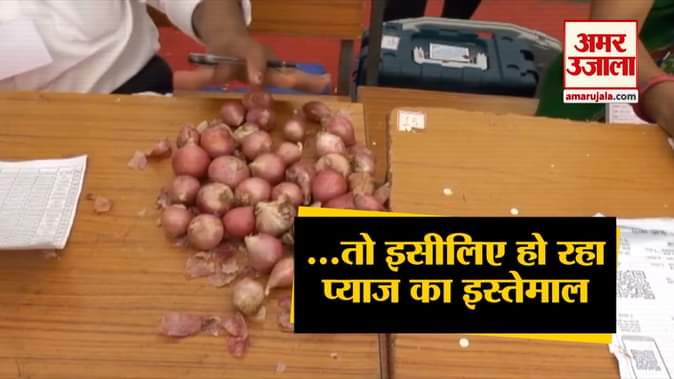 चुनाव अधिकारी भरी गर्मी में मतदान करवाने में जुटे हैं। गर्मी के थपेड़ों से निपटने के लिए इन अधिराकियों ने प्याज का सहारा लिया है। देखिए कैसे,
