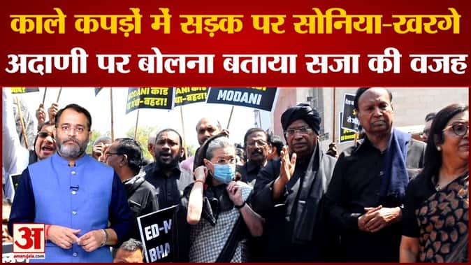 राहुल गांधी की सांसदी छिनने पर कांग्रेस नेताओं ने काले कपड़ों में किया विरोध-प्रदर्शन। अडानी मुद्दे और कांग्रेस नेता राहुल गांधी की लोकसभा सदस्यता खत्म किए जाने के खिलाल कांग्रेस समेत विपक्षी दल सड़कों पर उतर गए हैं। देश की राजधानी दिल्ली में संसद से सड़क तक विरोध प्रदर्शन देखने को मिले। विरोध कर रहे सांसदों ने काले कपड़े पहनकर मोदी विरोधी नारे लगाए। इस विरोध प्रदर्शन में सोनिया गांधी भी शामिल हुईं।