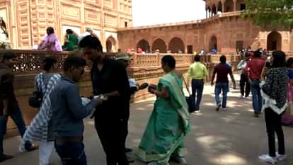 आगरा के ताजमहल की खूबसूरती को देखने देश ही नहीं दुनियाभर से लोग आते हैं। लेकिन ताजमहल के अंदर सक्रिय एक शातिर गिरोह की वजह से देश की छवि को बट्टा लग रहा है। अभी तक ताज के बाहर सक्रिय रहने वाले इन लोगों ने ताजमहल के अंदर भी पर्यटकों को ठगना शुरू कर दिया है। एक ताजा मामला सामने आया है जिसमें ये लोग पर्यटकों के इस्तेमाल किये हुए शू कवर उठाकर दूसरे पर्यटकों को बेच रहे हैं।