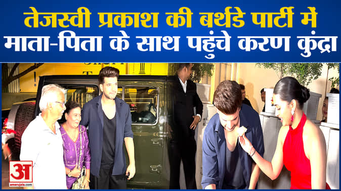 Tejasswi Prakash Birthday Celebration : Karan Kundrra काले रंग की टी-शर्ट और मैचिंग ट्राउज़र में आए नज़र ।