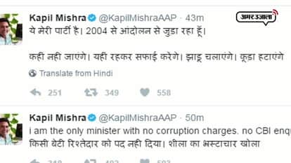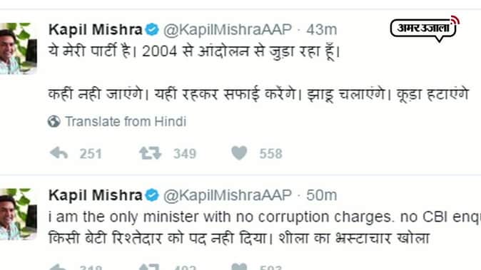 दिल्ली के मुख्यमंत्री अरविंद केजरीवाल ने कपिल मिश्रा को मंत्री पद से बर्खास्त कर दिया है। जिसके बाद कपिल मिश्रा ने एक के बाद एक ट्वीट कर जनता को सफाई दी और कहा ये मेरी भी पार्टी है मैं 2004 से जुड़ा हूं और यहीं रहकर सफाई करेंगे और झाड़ू लगाएंगे। लेकिन इस पूरे ट्विटर वॉर में जो खास बात थी वो ये की ट्विटर पर सक्रिय सीएम केजरीवाल ने इस बर्खास्तगी की जानकारी खुद ट्वीट कर नहीं बल्कि एक रिपोर्ट का ट्वीट को रीट्वीट कर लोगों को जानकारी दी।