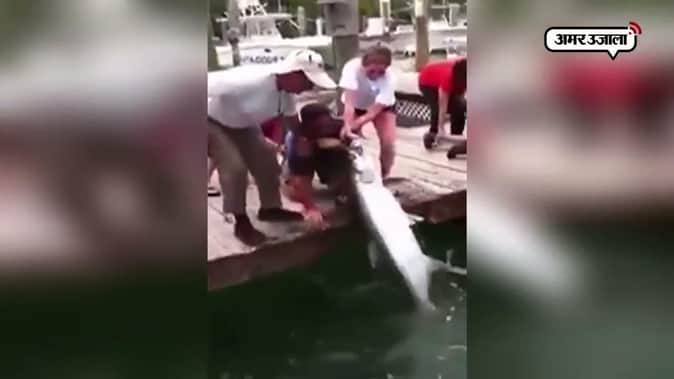आपने किसी शख्स को मछली को दाना खिलाते, खुद मछली का निवाला बनते देखा है? शायद नहीं ! चलिए हम आपको एक ऐसा वीडियो दिखाते हैं जिसमें मछलियों को दाना डालता एक शख्स खुद शार्क मछली का शिकार बन गया। वीडियो में एक शख्स मछली को दाना डालता नजर आ रहा है लेकिन तभी अचानक से एक शार्क मछली पानी से बाहर आकर उसके हाथ पर झपट्टा मार देती है। शार्क उस शख्स के हाथ को ऐसे दबोचती है कि छोड़ने का नाम ही नहीं लेती। ये मंजर देखकर आस-पास मौजूद सारे लोग भौचक्के रह जाते हैं।