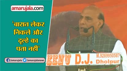 राजस्थान विधानसभा चुनाव में चुनाव प्रचार के दौरान गृहमंत्री राजनाथ सिंह एक चुनावी सभा को संबोधित करते हुए कांग्रेस पार्टी पर चुटकी ली। राजनाथ सिंह ने मुख्यमंत्री पद का चेहरा स्पष्ट नहीं होने की बात पर कहा कि राजस्थान में कांग्रेस में दूल्हे का पता नहीं है और बारात लेकर निकल गई है। ये स्थिति बिना दूल्हे की बारात जैसी ही है। आपको सुनाते हैं गृह मंत्री राजनाथ सिंह ने कांग्रेस पर किस तरह से जुबानी तीर छोड़े।