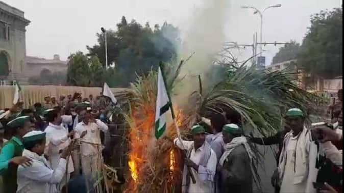 लखनऊ में किसानों ने विधानसभा के सामने जलाई फसलों की होली