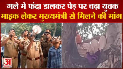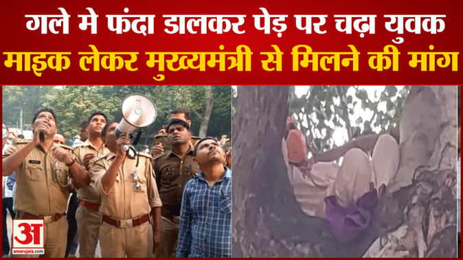 माइक लेकर, गला मे फंदा डाल पेड़ पर चढ़ा युवक, करने लगा मुख्यमंत्री से मिलने की मांग