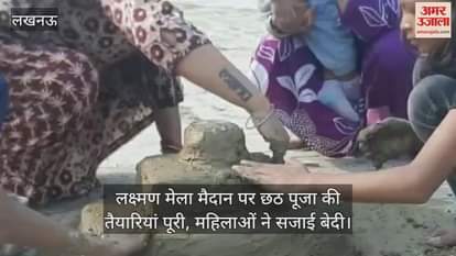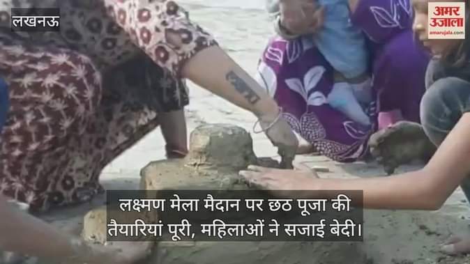 लखनऊ के लक्ष्मण मेला मैदान पर छठ पूजा की तैयारियां पूरी, महिलाओं ने सजाई बेदी