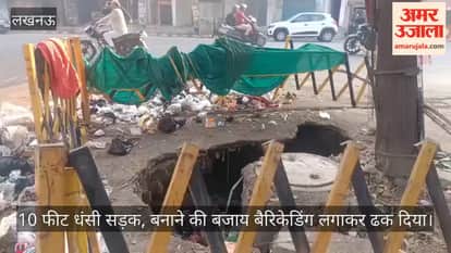लखनऊ में 10 फीट धंसी सड़क, बनाने की बजाय बैरिकेडिंग लगाकर ढक दिया