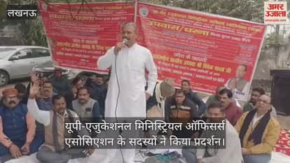 लखनऊ में अपनी मांगों को लेकर यूपी-एजुकेशनल मिनिस्ट्रियल ऑफिसर्स एसोसिएशन के सदस्यों ने किया प्रदर्शन