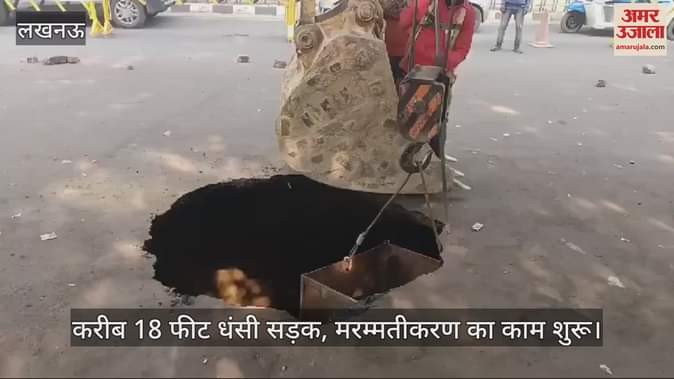 VIDEO : लखनऊ में करीब 18 फीट धंसी सड़क, मरम्मतीकरण का काम शुरू