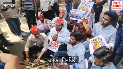 लखनऊ यूनिवर्सिटी: गेट नंबर- 1 पर समाजवादी छात्र सभा का प्रदर्शन, लकड़ी और कंडा लेकर पहुंचे