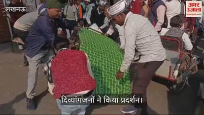 VIDEO : Lucknow: भाजपा कार्यालय के गेट पर खाट डालकर दिव्यांगजनों ने प्रदर्शन किया