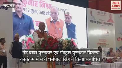 यूपी की राजधानी लखनऊ में शुक्रवार को गोमती नगर स्थित इंदिरा गांधी प्रतिष्ठान में नंद बाबा पुरस्कार एवं गोकुल पुरस्कार वितरण कार्यक्रम का आयोजन किया गया। इसमें मुख्य अतिथि के रूप में मंत्री धर्मपाल सिंह शामिल हुए। उन्होंने दीप जलाकर कार्यक्रम का शुभारंभ किया।