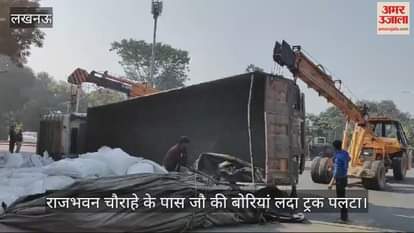 VIDEO : सीएम आवास से कुछ दूर राजभवन चौराहे के पास जौ की बोरियां लदा ट्रक पलटा