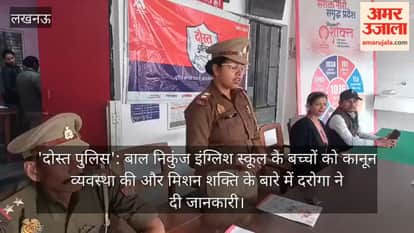 हजरतगंज स्थित महिला थाने में अमर उजाला द्वारा आयोजित दोस्त पुलिस में बाल निकुंज इंग्लिश स्कूल के बच्चों को कानून व्यवस्था की और मिशन शक्ति के बारे में जानकारी देतीं दरोगा संध्या।