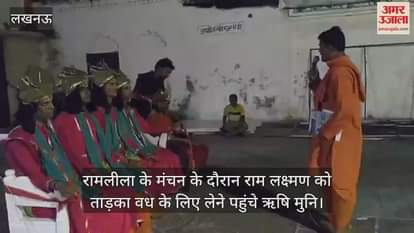 VIDEO: लखनऊ के सदर रामलीला के मंचन के दौरान राम लक्ष्मण को ताड़का वध के लिए लेने पहुंचे ऋषि मुनि