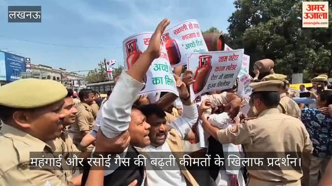 महंगाई और रसोई गैस की बढ़ती कीमतों को लेकर लखनऊ के हजरतगंज चौराहे पर सपा कार्यकर्ताओं ने प्रदर्शन किया।