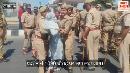 VIDEO: मुख्यमंत्री हेल्पलाइन नंबर में काम करने वाली युवतियों ने दिया धरना, 1090 चौराहे पर लगा जाम
