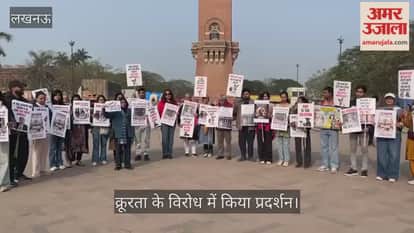 लखनऊ के चौक स्थित घंटाघर पर पशुओं के साथ हो रही क्रूरता के विरोध में प्रदर्शन करते लखनऊ के पशु प्रेमी राखी किशोर, डॉ पूजा, अमित, सुनीता पांडेय, चांदना, करू सक्सेना, प्रतीक, कंचन माला, शताक्षी, हर्षिता, गौरी, ऋषभ, पीयूष, आराध्या गुप्ता, अमृता, तन्वी, पुष्पलता।