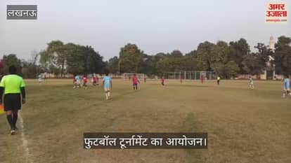 लखनऊ के चौक स्टेडियम में पहली स्वर्गीय हेम चंद जोशी मेमोरियल फुटबॉल टूर्नामेंट के फाइनल मुकाबले में स्पोर्ट्स कॉलेज लखनऊ बनाम एक्स स्टूडेंट के बीच हो रहे मुकाबले में गोल के लिए संघर्ष करते खिलाड़ी।