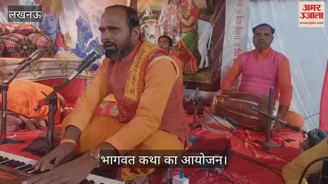 लखनऊ के निशातगंज स्थित श्री चंद्र बालेश्वर मंदिर में श्री हनुमंत सेवा संस्थान व वृंदावन धाम आश्रम की ओर से भागवत कथा में गुरु वंदना भजन गाते कामराज बाबा।