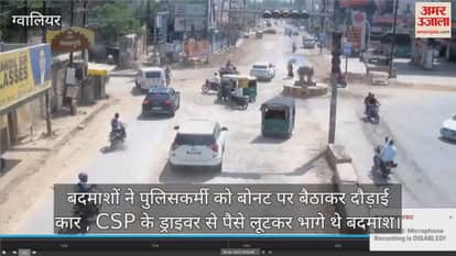 ग्वालियर में लूट के बाद भाग रहे बदमाशों को पकड़ने के दौरान एक पुलिसकर्मी उछलकर उनकी कार की बोनट पर चढ़ गया। लेकिन बदमाशों ने कार नहीं रोकी। पुलिसकर्मी बोनट पर लटका रहा। बदमाश इसी हालत में करीब एक किलोमीटर तक कार दौड़ाते रहे। इसका वीडियो भी सामने आया है। एक चौराहे पर जब कार की स्पीड कम हुई तो पुलिसकर्मी कूद गया। उसने राहगीरों की मदद से कार का बदमाशों का पीछा किया, लेकिन वो फरार हो गए। इसके बाद उसने अपने अधिकारियों को सूचना देकर नाकेबंदी कराई। आखिरकार कार सवार दो बदमाश गिरफ्त में आ गए, हालांकि तीन भाग गए।