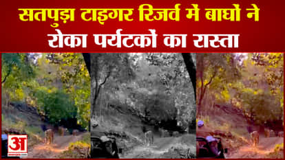 नर्मदापुरम: सतपुड़ा टाइगर रिजर्व में तीन बाघों ने रोका पर्यटकों का रास्ता, रोमांचित सैलानियों ने बनाया वीडियो