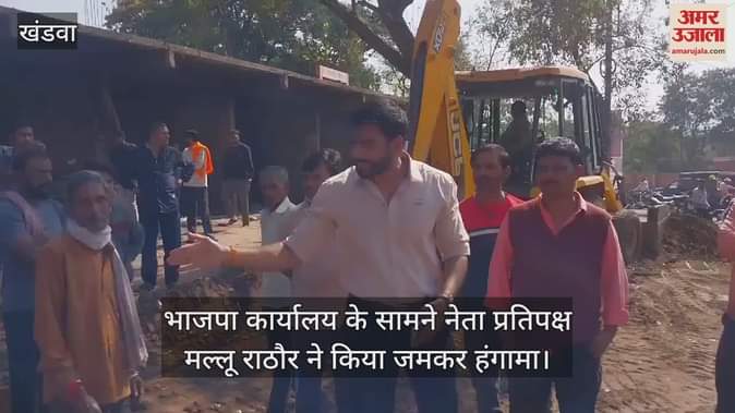मध्य प्रदेश के खंडवा नगर के इंदिरा चौक स्थित, भाजपा कार्यालय के सामने मंगलवार दोपहर बुलडोजर कार्रवाई अंजाम दी गई, जिसको लेकर निगम में विपक्ष के कांग्रेसी नेता दीपक उर्फ मल्लू राठौर इसका विरोध करते दिखाई दिए। दरअसल यहां स्थानीय निगम का अतिक्रमण दस्ता अवैद्ध गुमठियों और ठेलों को हटाने पहुंचा था। निगम की यह कार्रवाई जारी थी। उसी बीच मुल्लू राठौड़ वहां पहुंचकर हंगामा करने लगे। इस दौरान उनके साथ क्षेत्र से हटाए जा रहे गुमठी संचालक भी नारेबाजी करने लगे। उनका कहना था कि सुंदरता के नाम पर छोटे लोगों को हटाया जा रहा है, जबकि बीजेपी का कार्यालय भी अवैद्ध बना हुआ है। यहां से छोटे व्यापारियों को हटाकर बीजेपी के पदाधिकारियों के ऑफिस खुलवाए जाएंगे, जिसको लेकर निगम अधिकारी से जब उन्होंने सवाल किया, तो निगम के अधिकारी भाग खड़े हुए।