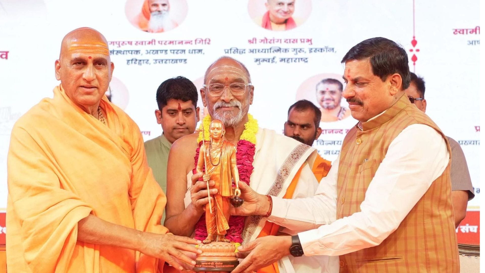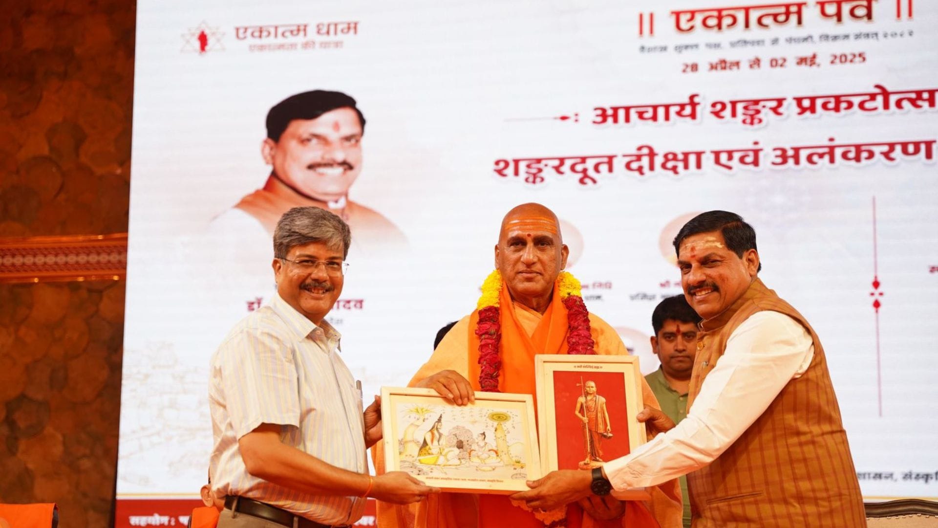 मध्यप्रदेश की पवित्र तीर्थनगरी ओंकारेश्वर में शुक्रवार को पांच दिवसीय एकात्म पर्व का भव्य समापन हुआ। पर्व के अंतिम दिन को आदि गुरु शंकराचार्य के प्रकटोत्सव के रूप में एकात्म धाम परिसर में बड़े धार्मिक उल्लास और श्रद्धा के साथ मनाया गया। इस अवसर पर प्रदेश के मुख्यमंत्री डॉ. मोहन यादव और जूना अखाड़ा के पीठाधीश्वर स्वामी अवधेशानंद जी महाराज सहित अनेक संत-महात्माओं की उपस्थिति रही। कार्यक्रम का शुभारंभ महर्षि सांदीपनि वेद विद्यापीठ और आर्ट ऑफ लिविंग गुरुकुल के आचार्यों द्वारा वैदिक अनुष्ठानों के साथ किया गया।