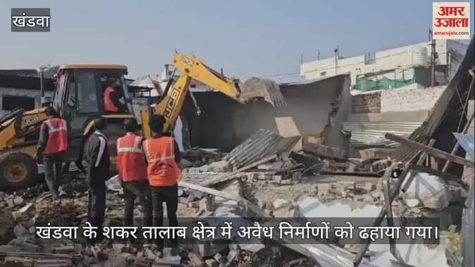 मध्यप्रदेश में खंडवा शहर के शकर तालाब क्षेत्र स्थित स्लाटर हाउस के आसपास बड़ी संख्या में किये गए अतिक्रमण पर शनिवार को जिला प्रशासन ने बड़ी कर्रवाई करते हुए कई कच्चे-पक्के निर्माण को ढहा दिया। बताया जा रहा है कि इस क्षेत्र में कई लोगों के द्वारा अवैध स्लाटर हाउस बना लिये गए थे, जिनकी मिल रही लगातार शिकायतों के बाद नगर निगम के साथ ही पुलिस और प्रशासन के अधिकारियों ने मिलकर यहां बने सरकारी स्लाटर हाउस का निरीक्षण किया। उसके बाद उसके आसपास बने इन अवैध स्लाटर हाउसों और निर्माण कार्यों पर बुलडोजर से ढहाने की कार्रवाई शुरू की गई। इस पूरी कार्रवाई के दौरान करीब 10 मकानों को जेसीबी की मदद से तोड़ा गया।