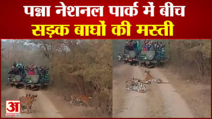 मध्यप्रदेश को बाघों के घर के रूप में जाना जाता है। देश में सबसे ज्यादा बाघ मध्यप्रदेश में पाए जाते हैं। प्रदेश में 6 टाइगर रिजर्व हैं। अक्सर प्रदेश के टाइगर रिजर्व से बाघों की अठखेलियों के खूबसूरत वीडियो वायरल होते रहते हैं। हाल ही में पन्ना जिले में स्थित पन्ना टाइगर रिजर्व से एक वीडियो सामने आया है, जिसमें तीन बाघ पार्क की सड़क पर मस्ती करते नजर आ रहे हैं। इस दौरान रास्ते में बैठे बाघों ने पर्यटकों का रास्ता रोक लिया। हालांकि पर्यटकों ने इस रोमांचक नजारे को खूब एंजॉय किया। सैलानियों ने बाघों की अठखेलियों का वीडियो बनाया है, जो कि सोशल मीडिया पर वायरल हो रहा है।