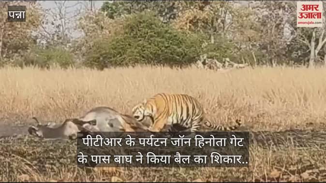 मध्यप्रदेश के पन्ना टाइगर रिजर्व (पीटीआर) के पर्यटन जोन हिनोता गेट के पास एक रोमांचक नजारा देखने को मिला, जब एक बाघ ने भारी-भरकम बैल का शिकार किया। इस दृश्य को देखकर वहां मौजूद पर्यटक सहम गए, लेकिन साथ ही उन्होंने इसे रोमांचक और दुर्लभ अनुभव भी बताया, क्योंकि बाघ को शिकार करते देखना बहुत ही रेयर घटना मानी जाती है।