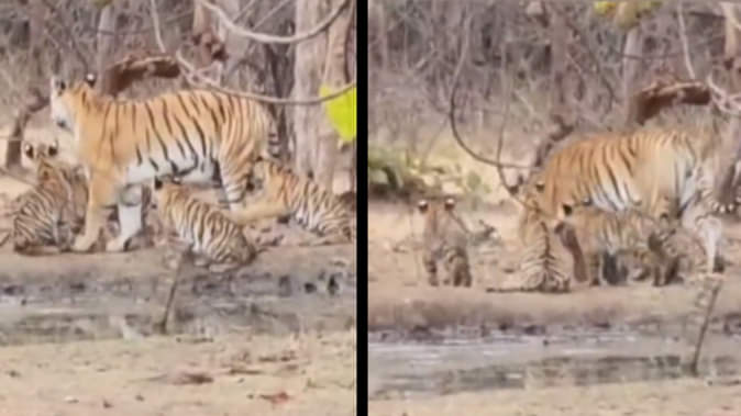 Pench Tiger Reserve: चार शावकों के साथ नजर आई बाघिन, पेंच नेशनल पार्क में पानी पीने का वीडियो आया सामने