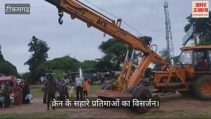 टीकमगढ़ एसडीएम संजय दुबे ने बुधवार सुबह बताया कि मंगलवार की दोपहर से मूर्तियों का विसर्जन शुरू हो गया था, जिसमें छोटी और मध्यम आकार की प्रतिमाओं का विसर्जन पहले किया गया। इसके बाद रात 8 बजे से विशाल प्रतिमाओं का जुलूस पंडाल से निकलना शुरू हुआ, जो सुबह 4 बजे तक चला। उन्होंने बताया कि प्रशासन ने सुरक्षा की दृष्टि से महेंद्र सागर तालाब में एक कुंड बनाया था, जहां सभी प्रतिमाओं का विसर्जन किया गया। सुरक्षा के लिए पुलिस अधीक्षक द्वारा एसडीओपी के मार्गदर्शन में करीब 150 जवान तैनात किए गए थे, जबकि राजस्व विभाग के एसडीएम, तहसीलदार और पटवारी भी मौके पर मौजूद थे। विशाल मूर्तियों का विसर्जन रात 8 बजे से शुरू हुआ, जिसमें डीजे और गाजे-बाजे के साथ जुलूस निकलते रहे, जो सुबह 4 बजे तक कुंड में पहुंचीं, जहां धूमधाम से उनका विसर्जन किया गया। मूर्तियों के विसर्जन के लिए क्रेन का उपयोग किया गया, जिसे नगर पालिका द्वारा उपलब्ध कराया गया था।
