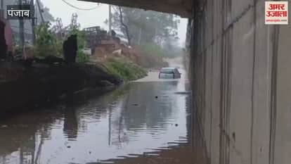 A car got stuck in water near a flyover due to rain in Pathankot.