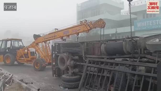 फगवाड़ा में ओवरटेक कर रही कार को बचाते पलटा ट्रक, यातायात हुआ अवरुद्ध