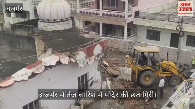 अजमेर में शनिवार सुबह से जारी तेज बारिश के चलते वार्ड संख्या 19 की कृष्ण कन्हैया कॉलोनी में स्थित राधाकृष्ण मंदिर की छत का एक हिस्सा भरभराकर पास ही स्थित मलुसार बावड़ी में गिर गया। गनीमत रही कि मंदिर में पहले से ही प्रवेश पर रोक थी, जिससे कोई जनहानि नहीं हुई।