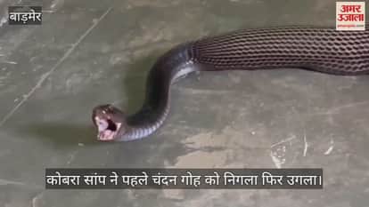 बाड़मेर जिले के आकोड़ा गांव में रविवार को एक किसान के घर पर भारी भरकम कोबरा सांप देख हड़कंप मच गया। सांप अपनी जगह से हिल नहीं रहा था। किसान ने तुरंत बाड़मेर के वाइल्डलाइफ रेस्क्यू विशेषज्ञ, कोबरामैन मुकेश माली को बुलाया। मुकेश माली अपनी टीम के साथ मौके पर पहुंचे और कोबरा सांप को पकड़ने का प्रयास किया। इस दौरान सांप ने धीरे-धीरे मुंह से निगले हुए जीव को बाहर उगल दिया। आश्चर्यजनक बात यह थी कि वह जीव एक चंदन गोह था, जो पहले ही मृत अवस्था में था।