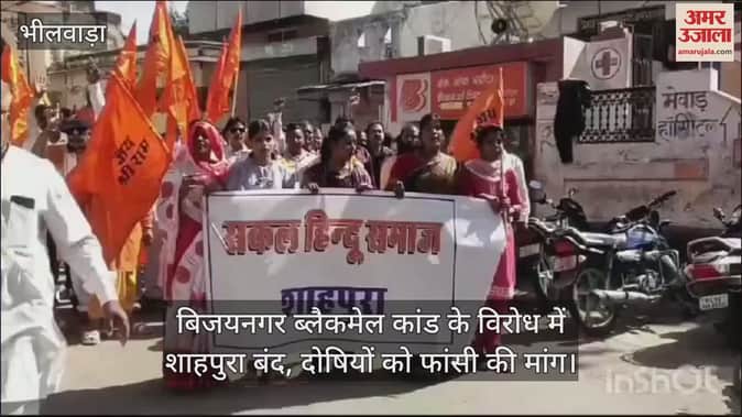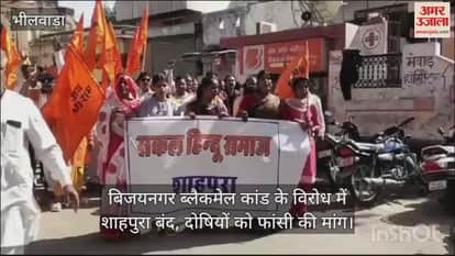 अजमेर जिले के बिजयनगर में हुए ब्लैकमेल कांड के विरोध में मंगलवार को शाहपुरा में सर्व हिंदू समाज के आह्वान पर सुबह 11 बजे तक बाजार बंद रहे। इस दौरान संतों के नेतृत्व में जुलूस निकालकर एसडीओ कार्यालय के बाहर प्रदर्शन किया गया। प्रदर्शनकारियों ने मुख्यमंत्री के नाम ज्ञापन सौंपते हुए दोषियों को फांसी देने की मांग की। सुबह से ही शाहपुरा के प्रमुख बाजारों में सन्नाटा पसरा रहा। संत समाज और हिंदू संगठनों के नेतृत्व में सैकड़ों महिला-पुरुषों ने रैली में भाग लिया। यह विरोध रैली महलों की चैक से उपखंड कार्यालय तक निकाली गई। प्रदर्शनकारियों ने दोषियों को फांसी दो के नारे लगाते हुए प्रशासन को कठोर कार्रवाई की मांग से अवगत कराया। इसके बाद मुख्यमंत्री भजनलाल शर्मा के नाम एसडीओ को ज्ञापन सौंपा गया।