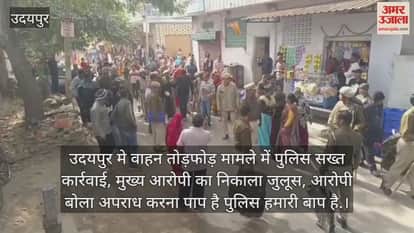 उदयपुर में वाहन तोड़फोड़ मामले में पुलिस ने गुरुवार को सख्त कार्रवाई की। जिसमें मुख्य आरोपी का जुलूस निकाला। जुलूस के दौरान आरोपी बोलता दिखा की अपराध करना पाप है पुलिस हमारी बाप है। आरोपी के जुलूस देखने सैकड़ों की संख्या में लोग एकत्रित हो गए, और पुलिस की इस कार्यवाही पर जिंदाबाद के नारे लगाते नजर आये।