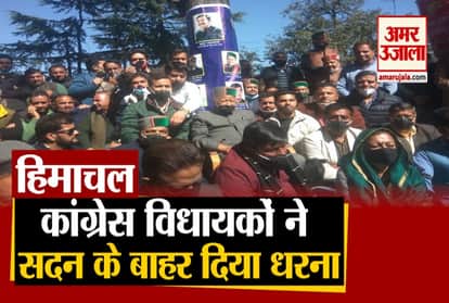 Former CM virbhadra singh and Suspended Congress MLAs staged dharna outside himachal pradesh vidhan sabha