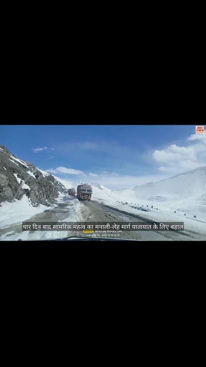 सामरिक महत्व का मनाली-लेह मार्ग मंगलवार को चार दिन बाद यातायात के लिए बहाल हो गया है। बीआरओ ने जिंगजिंबार व बारालाचा से बर्फ हटाकर हाईवे तीन को बहाल कर बड़ी राहत दी है। दोपहर करीब 1:00 के बाद दोनों तरफ से ट्रकों के साथ छोटे वाहन अपने गंतव्य की ओर रवाना किए गए। दारचा की तरफ से 259 ट्रकों के साथ कुल 425 वाहन भेजे गए। जिसमें 34 बाइक और 132 अन्य छोटे वाहन शामिल हैं। सीमा सड़क संगठन ने कड़ी मशक्कत के बाद हाईवे को यातायात के लिए खोला है।