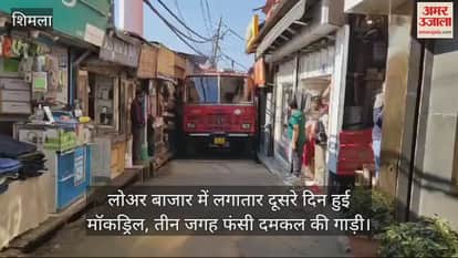 शिमला शहर के लोअर बाजार में लगातार दूसरे दिन बुधवार को मॉकड्रिल हुई। मॉकड्रिल के दाैरान तीन जगह दमकल की गाड़ी फंसी। नगर निगम ने तीनों जगह कारोबारी को बढ़े हुए छज्जे तोड़ने के लिए नोटिस जारी कर दिए हैं। कुल चार तहबाजारी का सामान भी जब्त किया गया। प्रदेश हाईकोर्ट के आदेश पर शहर के लोअर बाजार में रोज मॉकड्रिल हो रही है।