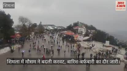 शिमला में माैसम ने करवट बदली है। राजधानी शिमला बारिश हो रही है। रिज, जाखू, संजाैली-ढली क्षेत्र में हल्की बर्फबारी भी हो रही है। वहीं बर्फबारी की आस में बड़ी संख्या में सैलानी शिमला पहुंचे हैं।